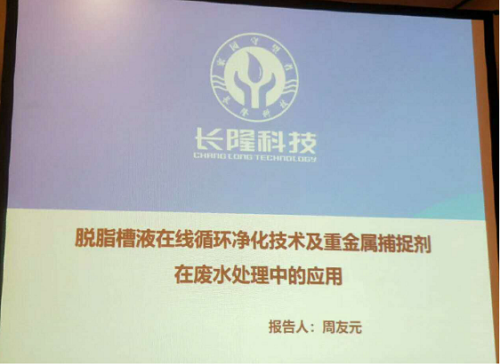 长隆科技的汇报主题是“脱脂槽液在线循环净化技术及重金属捕捉剂在废水处理中的应用”。